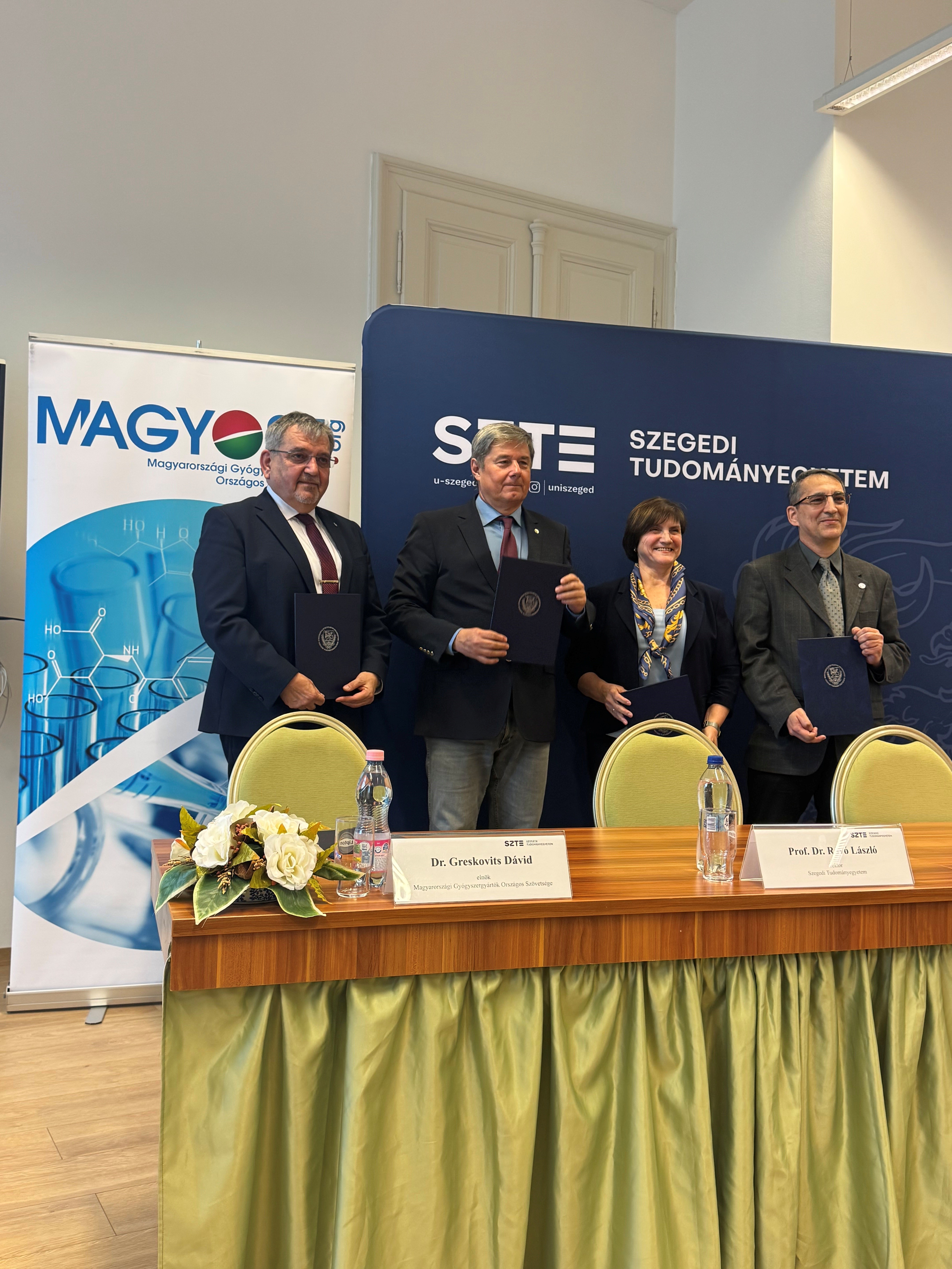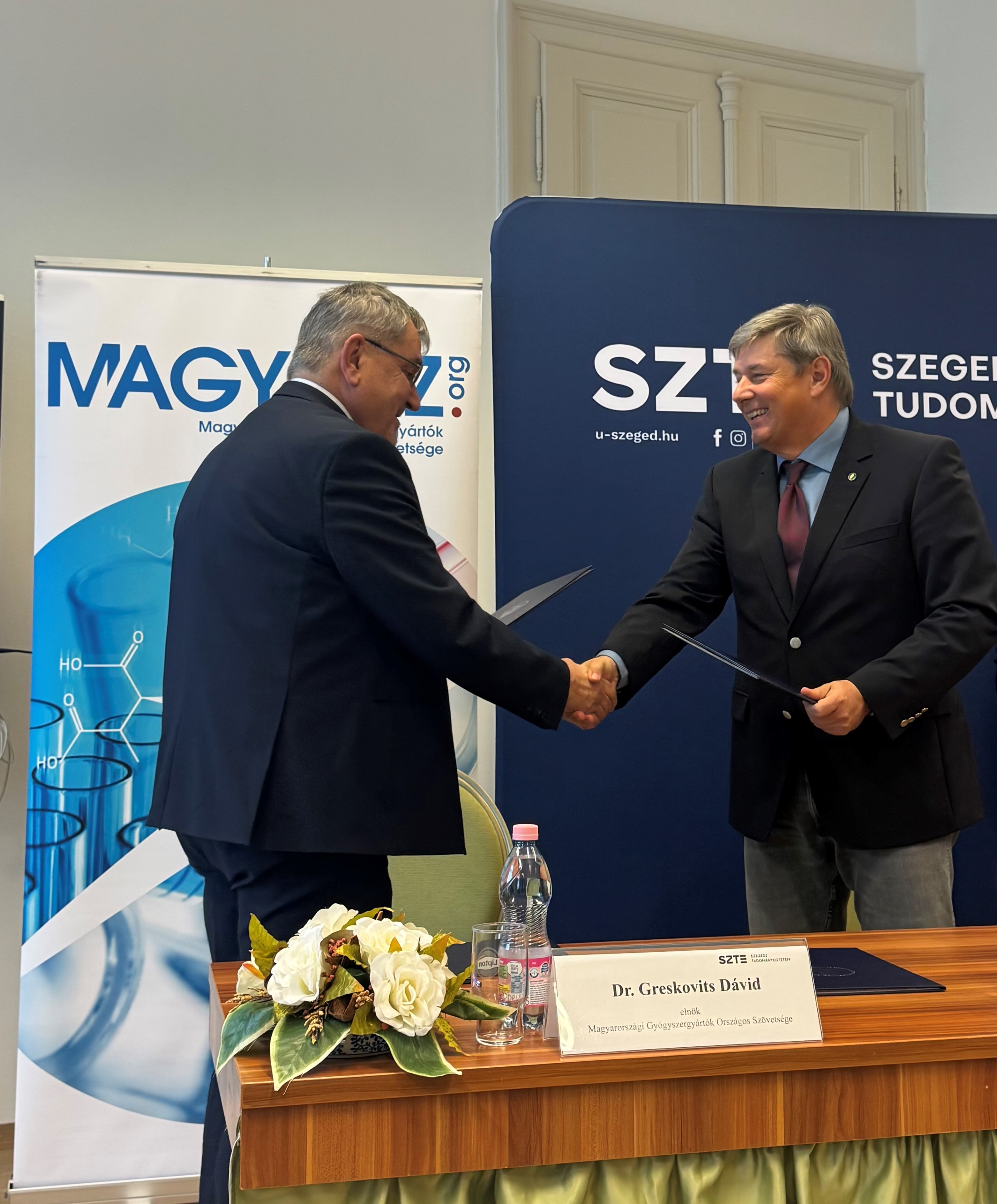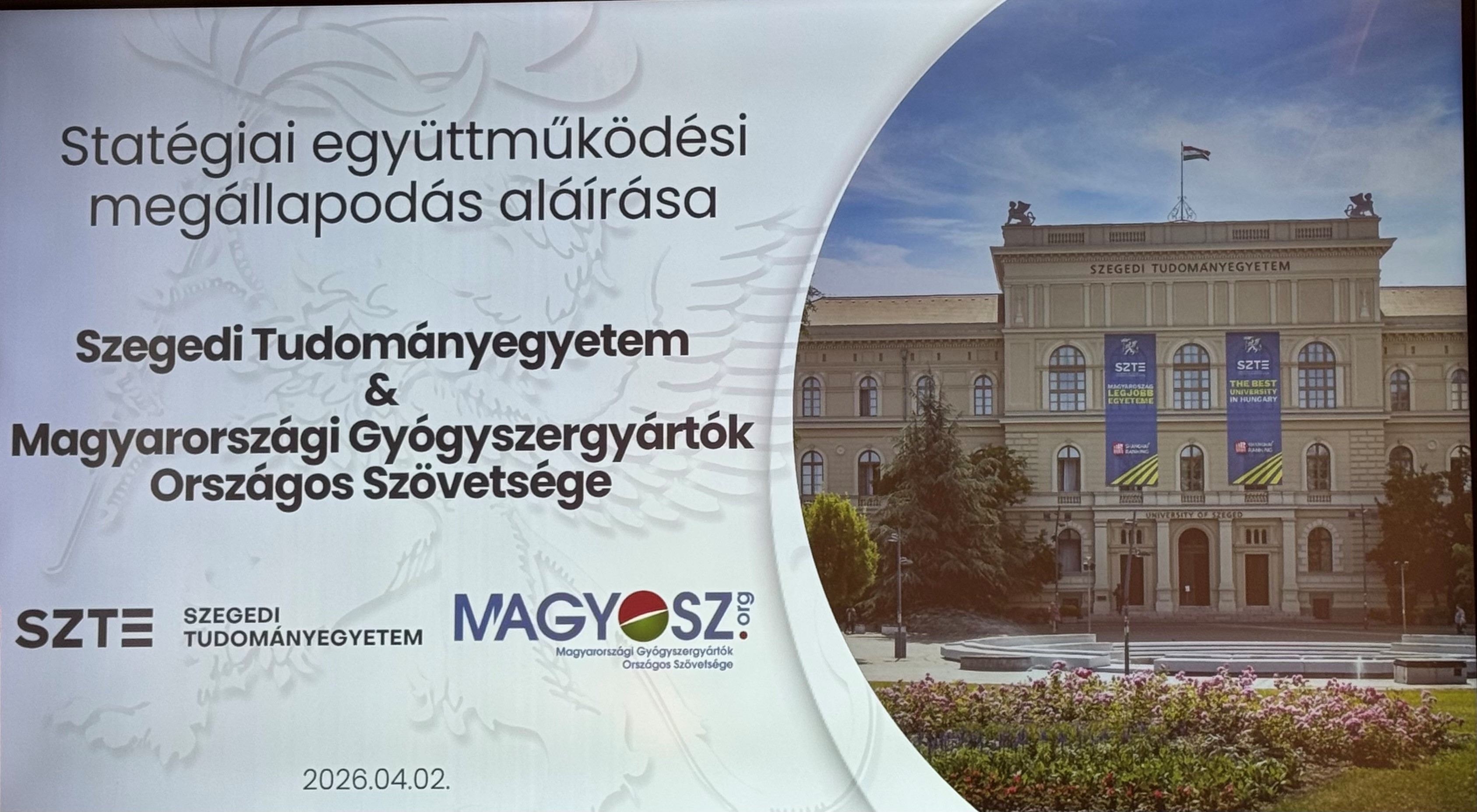 A Magyarországi Gyógyszergyártók Országos Szövetsége (MAGYOSZ) és a Szegedi Tudományegyetem (SZTE) a mai napon aláírta azt a stratégiai együttműködési megállapodást, amely új szintre emeli a hazai gyógyszeripar és a felsőoktatás kapcsolatát. A partnerség célja, hogy hosszú távon biztosítsa a magyar gyógyszeripar versenyképességét, a kutatás-fejlesztési kapacitások erősítését és a természettudományos felsőoktatás támogatását – mindezt az egyetem és az iparág szoros, tartalmi együttműködésével.